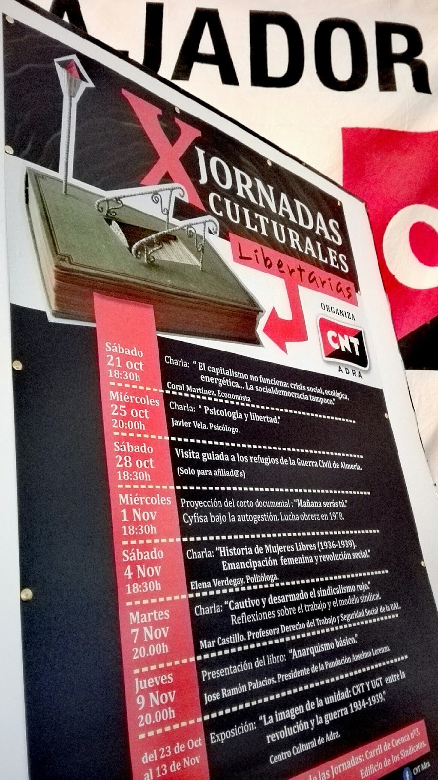 Conferencias, presentación de libros, exposiciones y una visita guiada a los refugios de la Guerra Civil de Almería conforman el programa de la décima edición de las jornadas culturales libertarias que la central anarcosindicalista organiza en Adra. Unas jornadas donde empaparse de una visión crítica de la sociedad actual y familiarizarse con conceptos políticos propios del anarquismo como la autogestión, la democracia directa, el antiestatismo, la lucha de clases, feminismo etc, valores que sin duda hay que reavivar para recuperar algo de terreno a la obscena mercantilización de los ámbitos político, cultural y social en los que estamos inmersos. También hay hueco para la profusa historia de esta filosofía política que impregnó, no solo el desarrollo del movimiento obrero, sino que es imprescindible para explicar la historia de este país en el primer tercio del siglo XX.