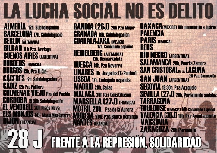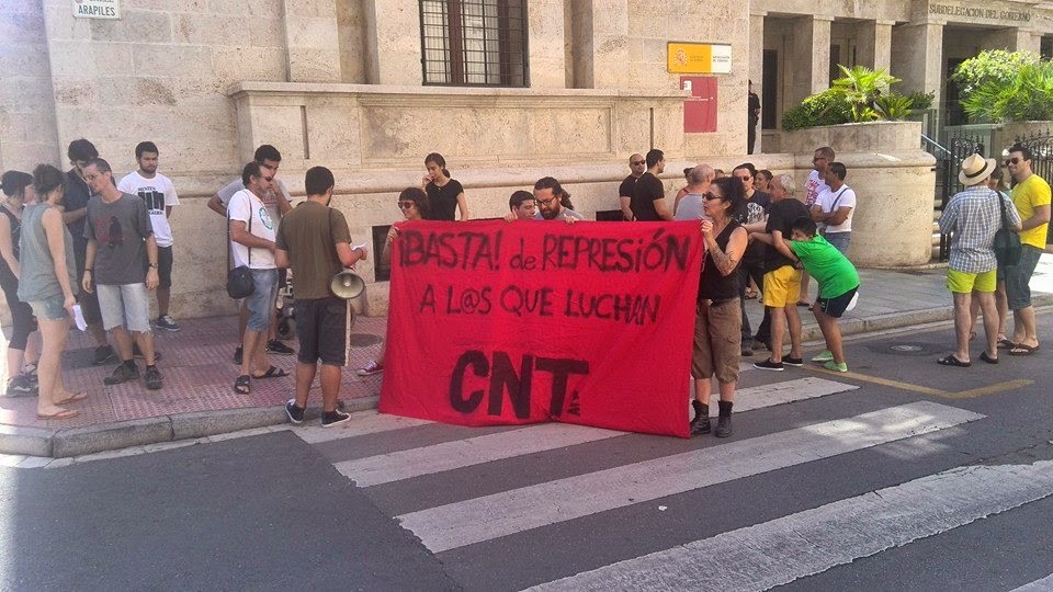 Compañeros y compañeras de la CNT de Adra y Almería y militantes de otros colectivos se concentraron el pasado 28 de junio en la sede de la Subdelegación de Gobierno en Almería. Con este acto se volvía a denunciar la represión de los movimientos sociales, particularmente, la represión contra los integrantes de piquetes informativos en las últimas huelgas generales. Es el caso de Carlos y Carmen, condenados a tres años y un día por su participación en los piquetes informativos organizados por el 15-M en la pasada Huelga General en la ciudad de Granada.