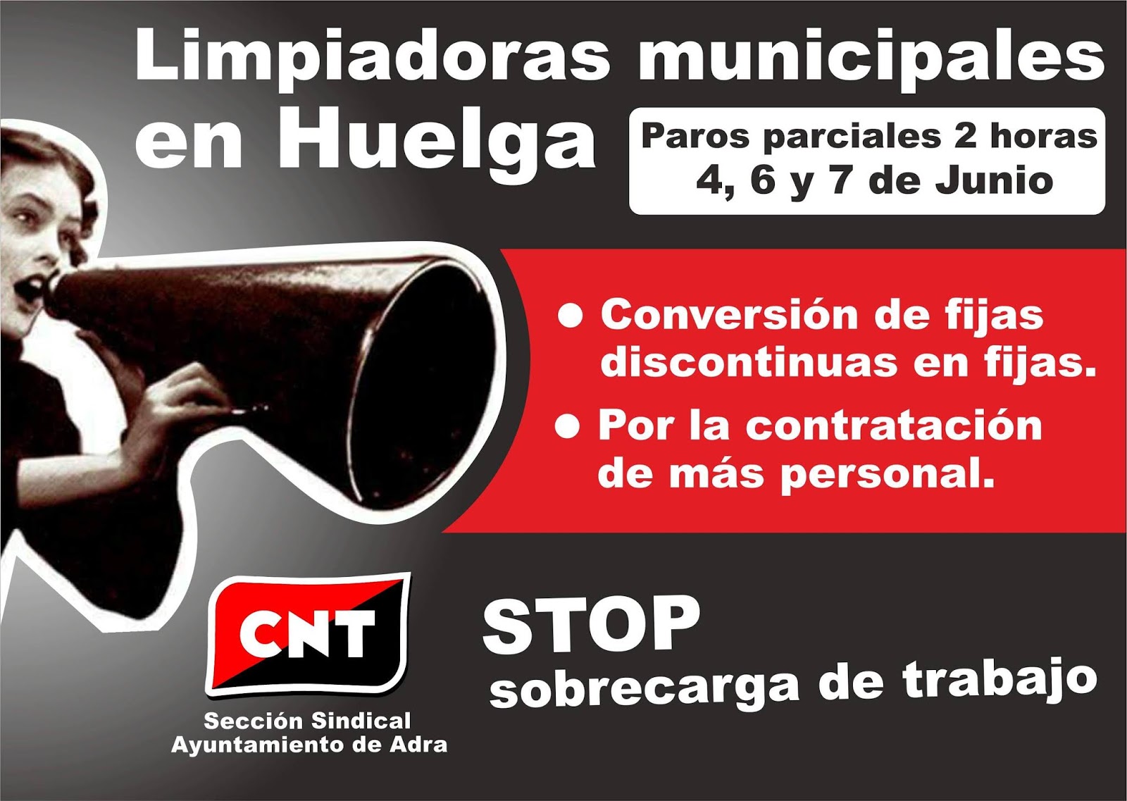 La sección sindical de CNT en el Ayuntamiento de Adra ha convocado paros parciales de dos horas los días 4, 6 y 7 de junio para reclamar la ampliación de la plantilla de limpiadoras municipales con nuevas contrataciones y la conversión de los contratos fijos discontinuos existentes en fijos. Estos paros, previstos al inicio del turno, están convocadas todas las limpiadoras municipales y son consecuencia de la nula voluntad por parte del ayuntamiento de atender las demandas de más personal que desde la central anarcosindicalista CNT, central con mayor afiliación entre el colectivo, viene reclamando al consistorio para poder prestar un servicio con un mínimo de calidad.
