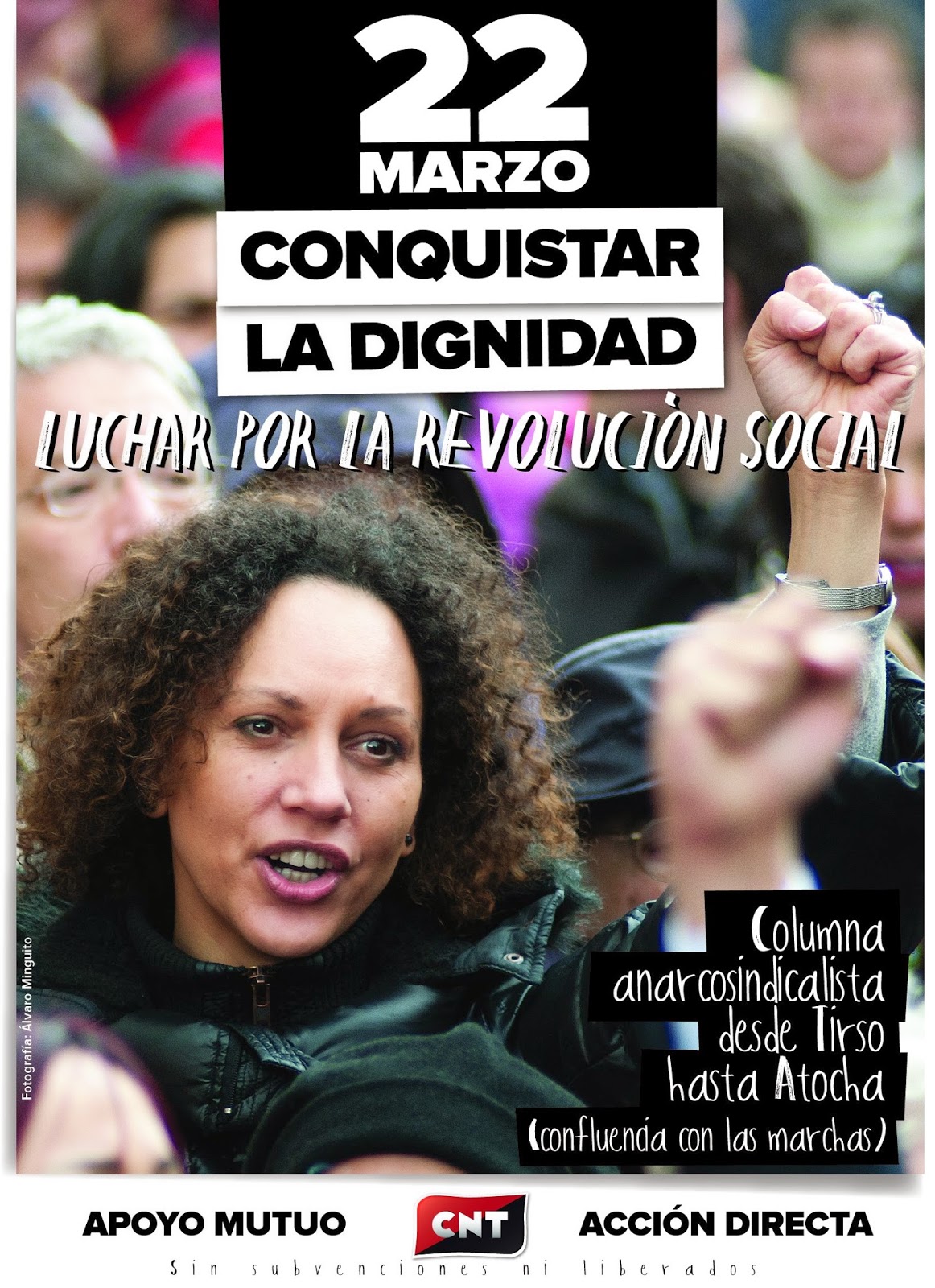 El 22 de marzo desembocan en Madrid las MARCHAS DE LA DIGNIDAD. Cientos de compañeros a la vez que militantes de otras organizaciones, recorren ya, el camino hacia la capital del Estado. Desde la CNT de Adra aportamos militantes a esta iniciativa. Ese día, en Madrid, habrá compañeros que acudan a hacer oír con fuerza en las marchas la voz del anarcosindicalismo.